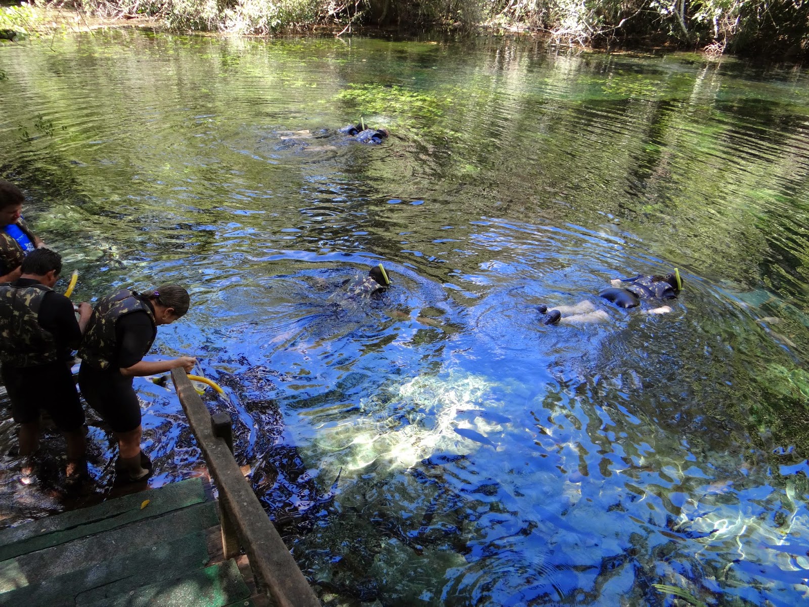 Dali seguimos para a piscina para um rápido treinamento (imagem ao lado) e conhecimento de algumas regras para a flutuação. Chega então o momento esperado para a flutuação, seguimos numa trilha, uma pequena caminhada observando a fauna local e algumas nascentes. Ao alcançar o rio iniciamos a exploração do local seguindo sempre as orientações do guia, nesta primeira parte podemos observar durante o mergulho, algumas nascentes, a vegetação subaquática e alguns cardumes. Neste momento também posamos para fotos submersos (há um fotógrafo no local e posteriormente você pode comprar o material).
