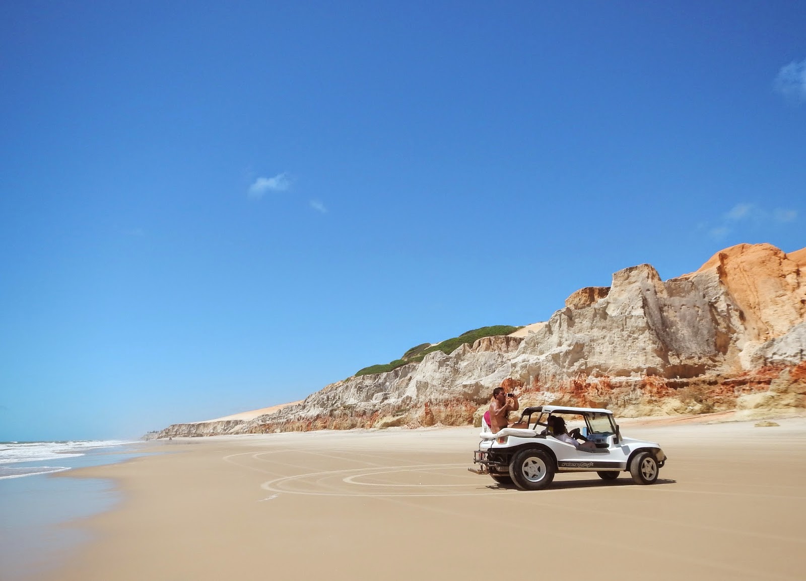 Uma verdadeira caravana de bugres saiu passando por uma praia e um vilarejo onde descemos pra caminhar por entre as falésias acompanhados de um outro guia local, engraçado diga-se de passagem, adorava fazer uma piada com sogras. Logo no início da caminhada passamos por barracas de artesanato, uma bela feira que tem como destaque os trabalhos feitos com sílica, as areias coloridas.Seguimos o passeio por uma área preservada onde somente se faz o percurso a pé, vimos o farol de Morro Branco, alguns mirantes e descemos até a praia por entre as fendas, o que chamam de Labirinto das falésias. Ao final desta caminhada os guias pedem uma contribuição. Um passeio bem legal!